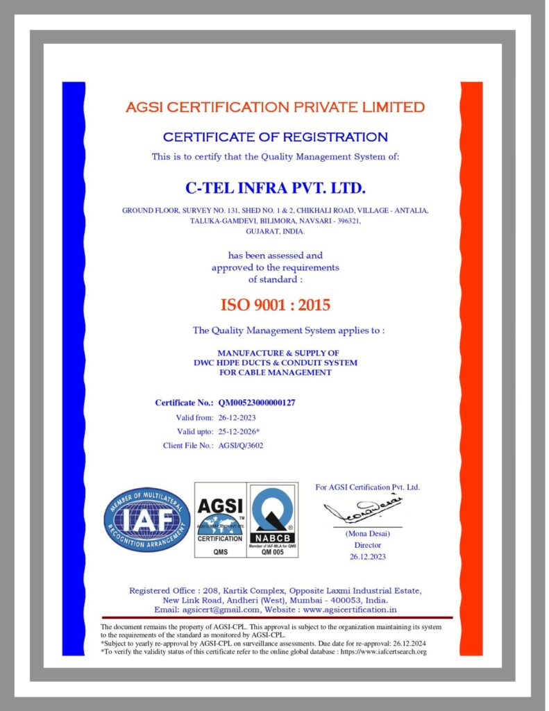 C-TEL Infra Pvt Ltd is ISO Certified as per QMS 9001:2015